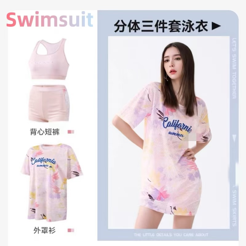 新款泳衣女三件套分体防晒平角裤保守时尚罩衫游泳衣沙滩温泉泳装