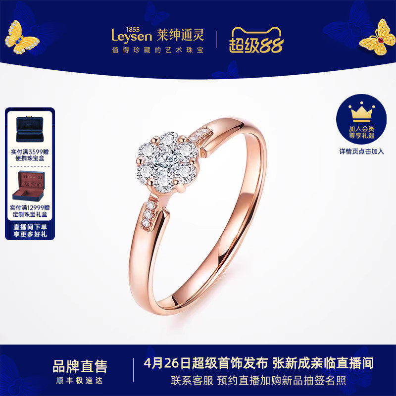 莱绅通灵钻石戒指 求结婚钻戒女18K金群镶玫瑰金花型显钻 翠贝卡