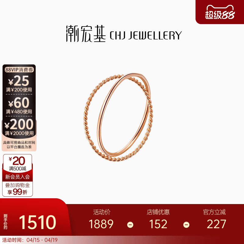 潮宏基至简红18K金戒指玫瑰金红18K叠戴素圈2合1送女生日礼物