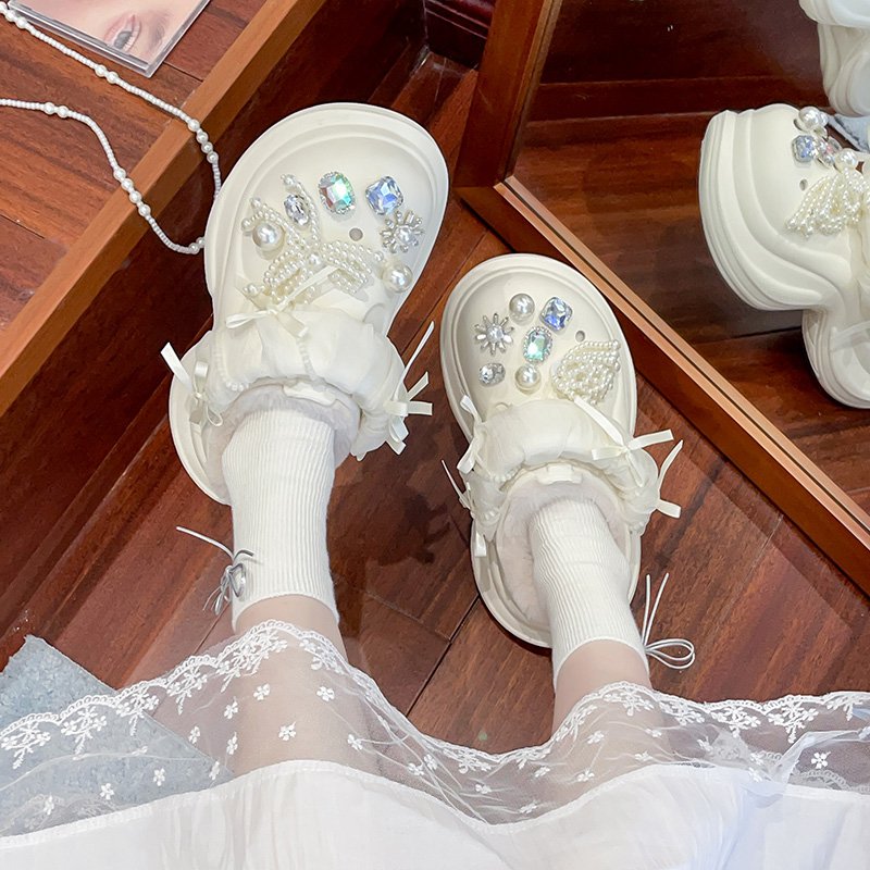 精致可爱小公主珍珠蝴蝶结加绒洞洞鞋女秋冬季外穿厚底增高棉拖鞋