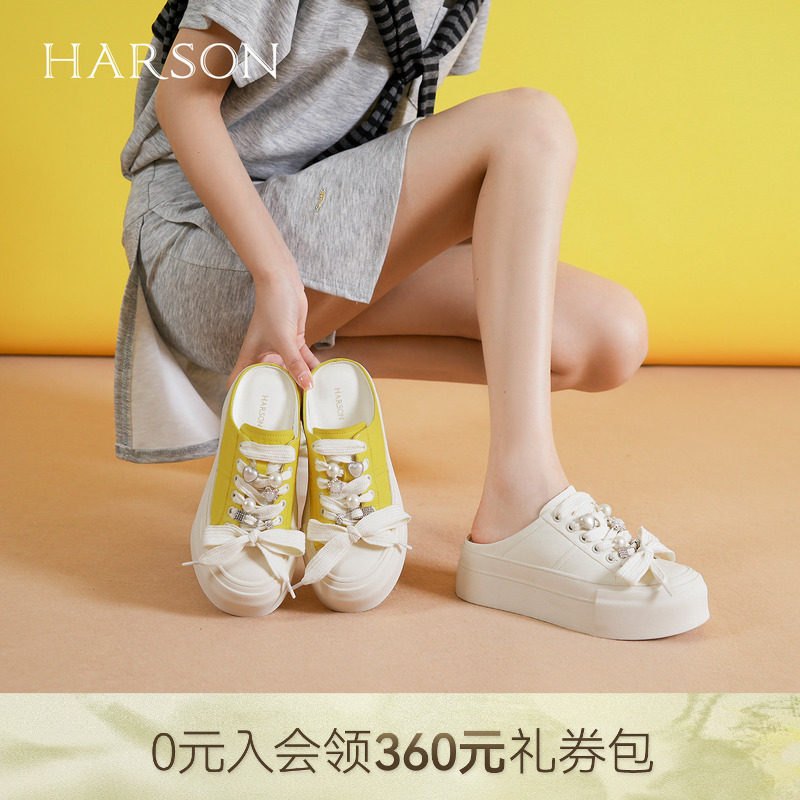 哈森真皮厚底包头拖鞋女夏季新款珍珠蝴蝶结休闲鞋HCM251201