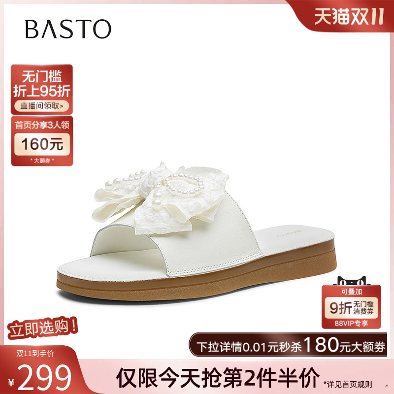 百思图2025夏商场新款珍珠蝴蝶结一字拖休闲外穿女凉拖鞋CO652BT5
