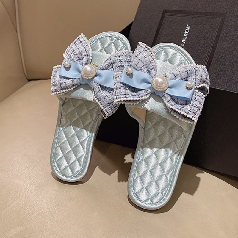 法式珍珠蝴蝶结缎面新娘伴娘结婚拖鞋居家酒店室内防滑家用凉拖鞋