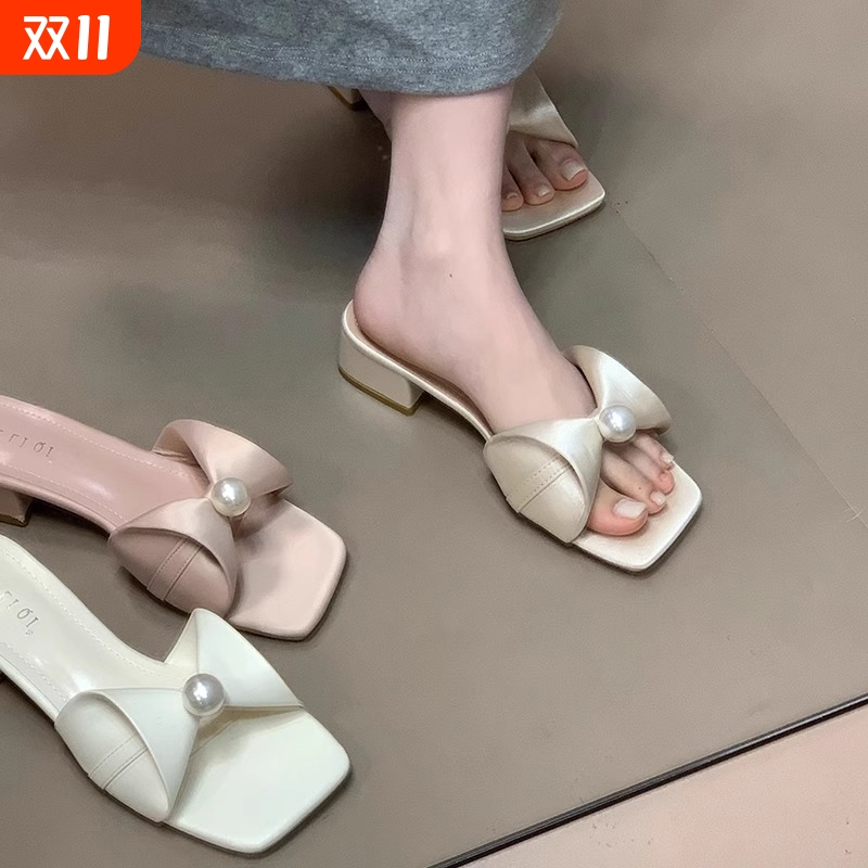 法式粗跟百搭配裙子方头凉拖鞋女夏季蝴蝶结外穿珍珠一字拖鞋中跟