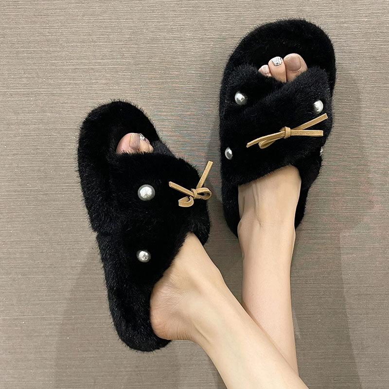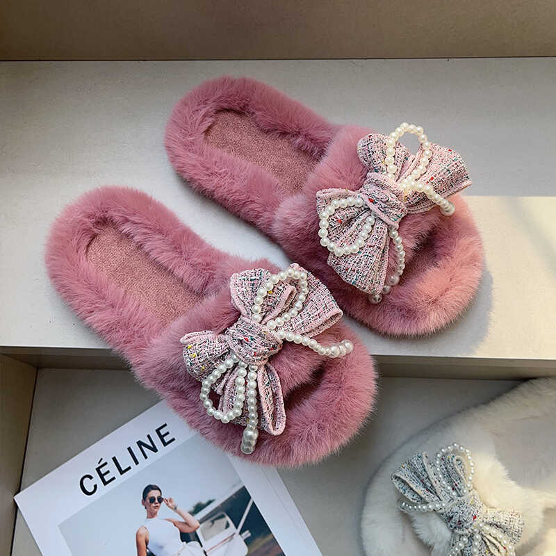 拖鞋女秋冬季珍珠蝴蝶结毛毛拖甜美居家公主鞋毛绒外穿平底防滑鞋