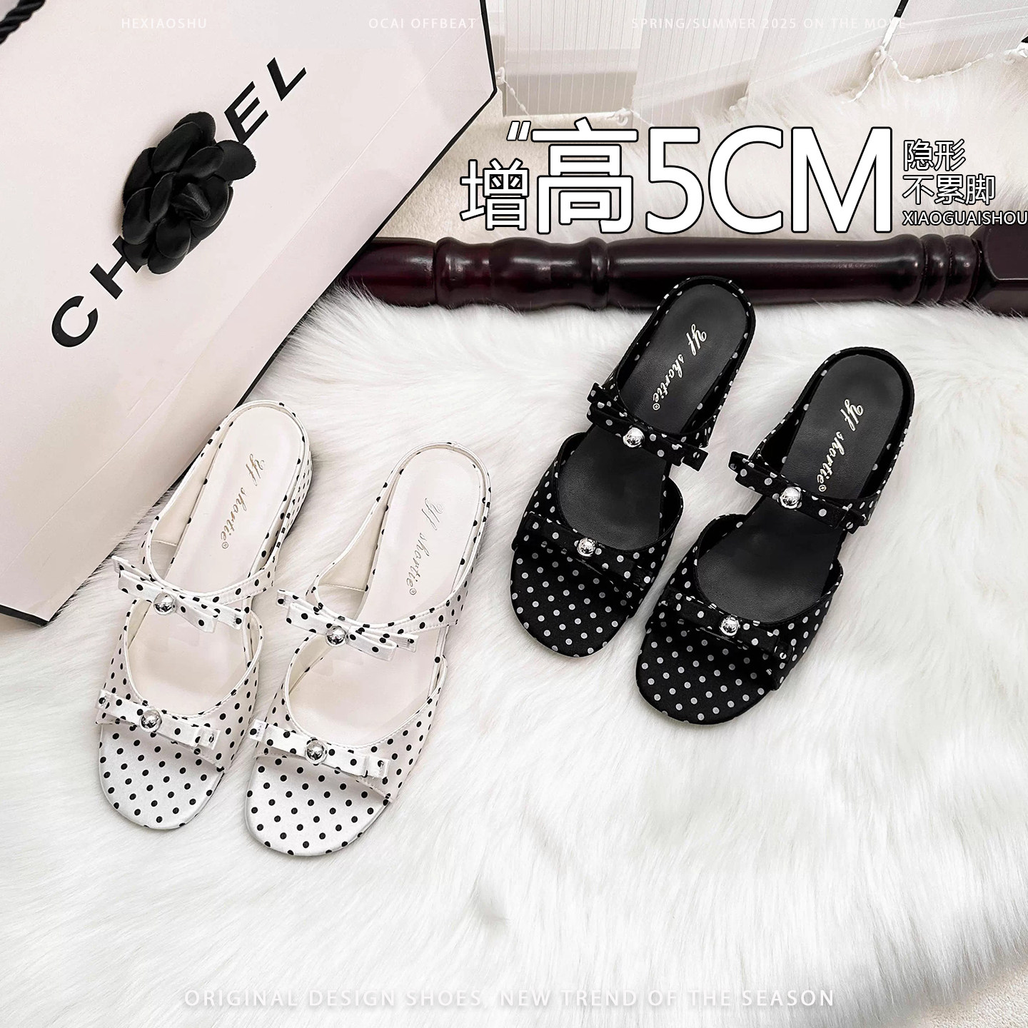增高5CM珍珠蝴蝶结波点一字拖女2026新款小香风仙女风露趾凉拖鞋