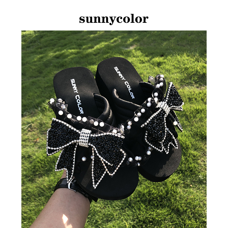 SUNNY COLOR拖鞋女夏外穿ins潮珍珠蝴蝶结凉拖防滑时尚百搭沙滩鞋
