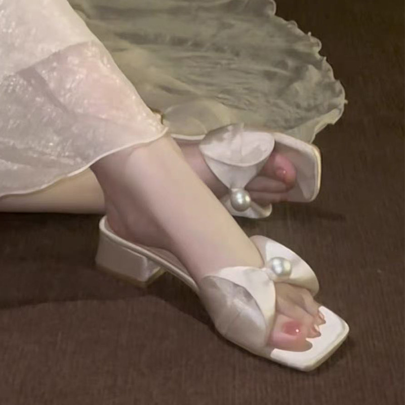 法式粗跟蝴蝶结珍珠方头凉拖鞋女夏季百搭外穿配裙子仙女一字拖鞋