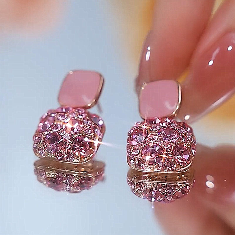 时尚精致粉色锆石小方糖耳环女韩国气质耳坠2025年新高级百搭耳饰