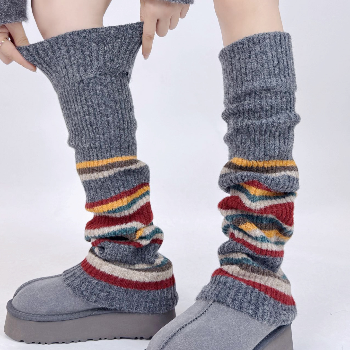 韩版秋冬保暖羊毛袜套女长筒条纹文艺学院风小腿显瘦堆堆袜ins潮
