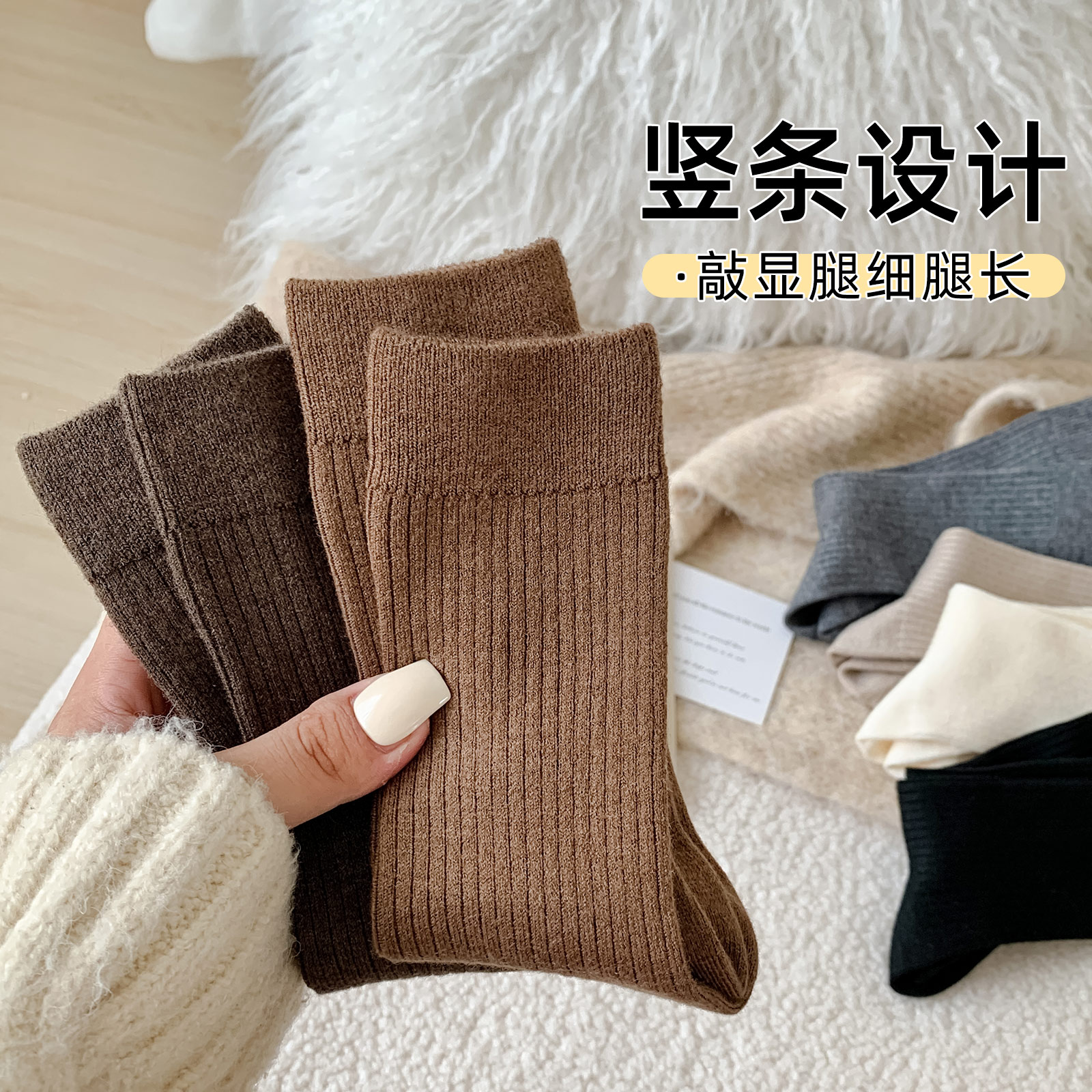 秋冬纯色保暖羊毛袜子女中筒袜咖色软糯不扎加厚长袜冬天抗寒耐穿