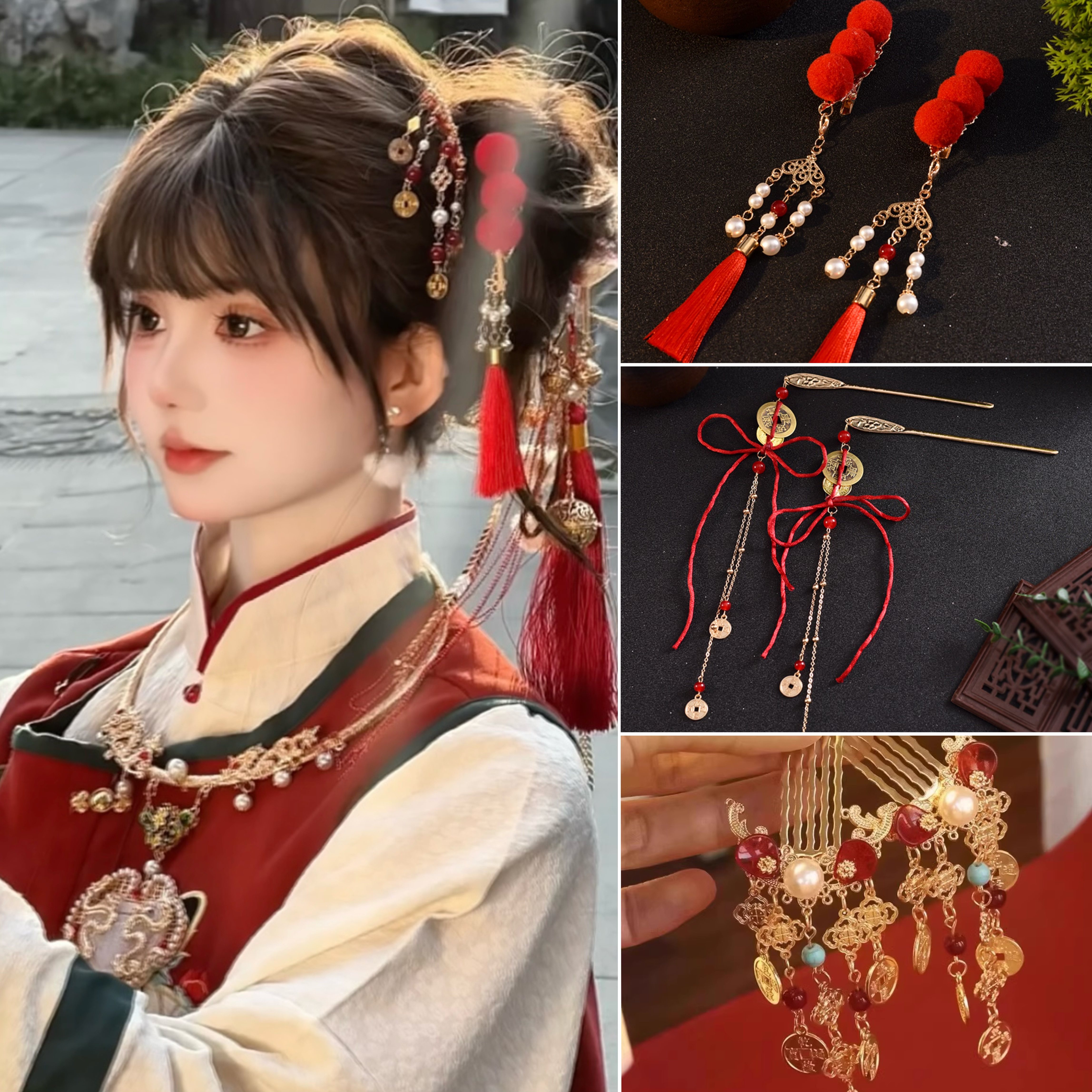 古风头饰秋冬汉服百搭新年喜庆发夹仿铜钱毛球手工对夹长流苏头饰