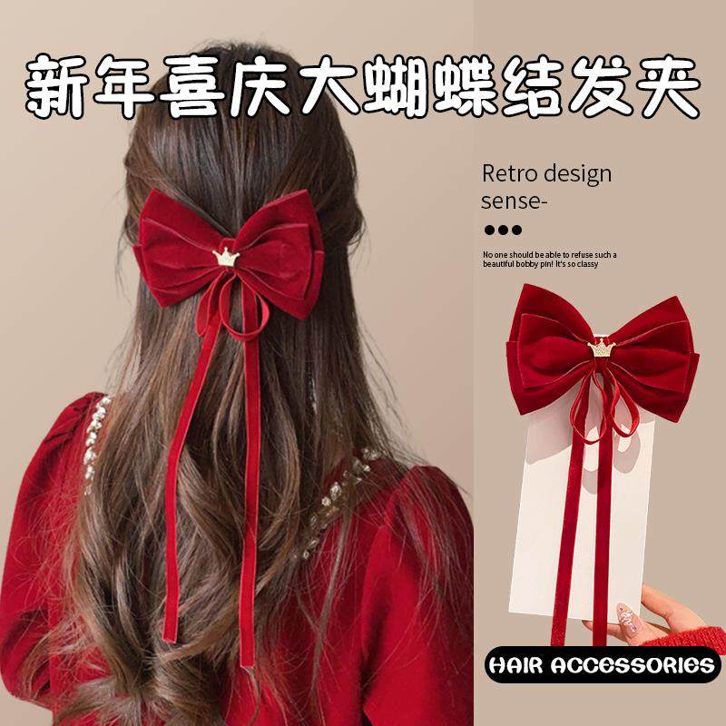 新年喜庆红色大蝴蝶结金丝绒星星发夹发饰流苏头饰顶夹女秋冬发卡