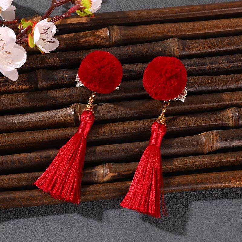 红色头饰新年儿童发夹中国风汉服发卡宝宝古风拜年毛球流苏头饰女
