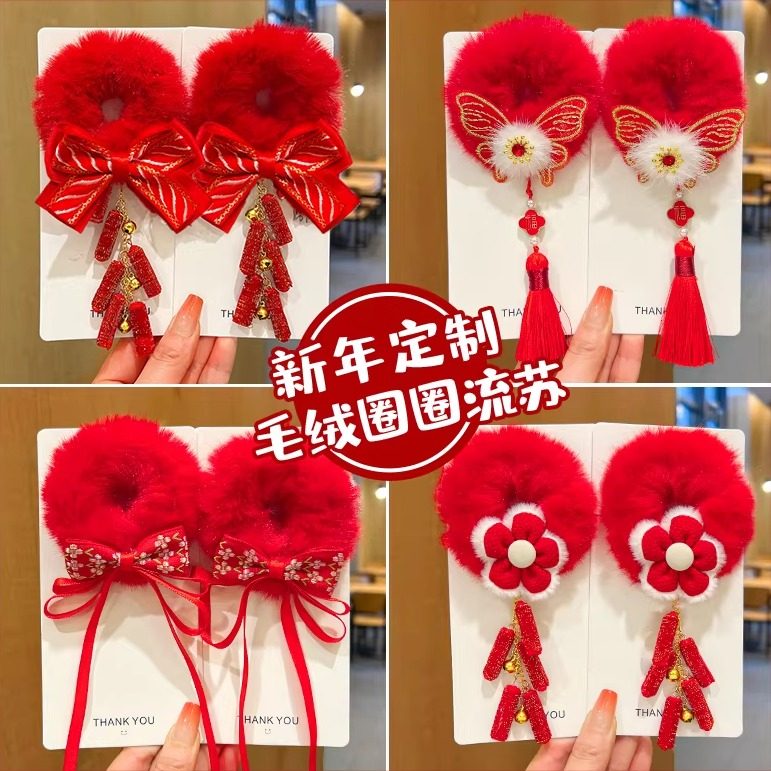 新年头饰中国风流苏大红色毛圈头绳儿童喜庆扎丸子头发圈元旦跳舞