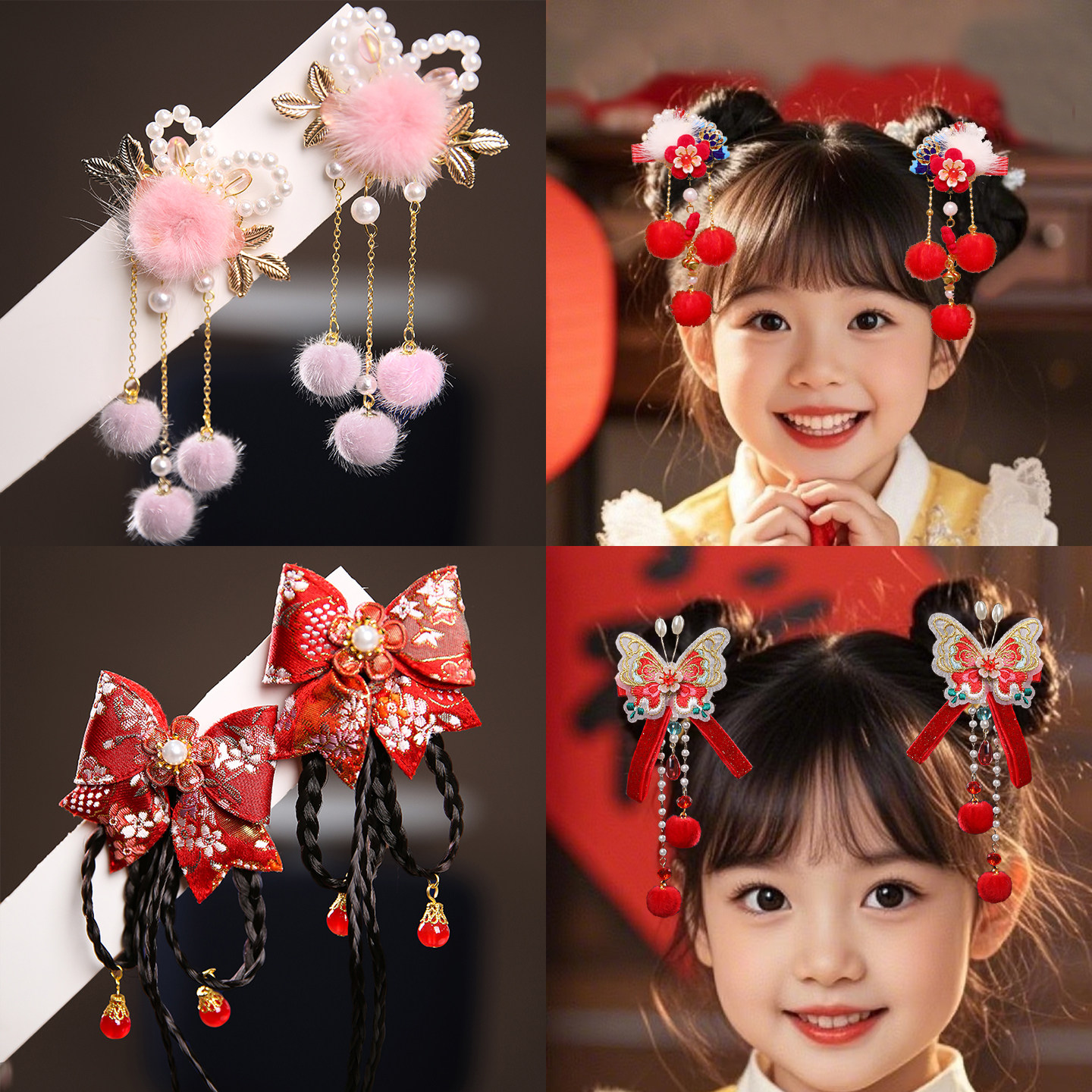 2026新年红色儿童古风发夹女宝宝汉服公主头饰流苏中国对夹拜年