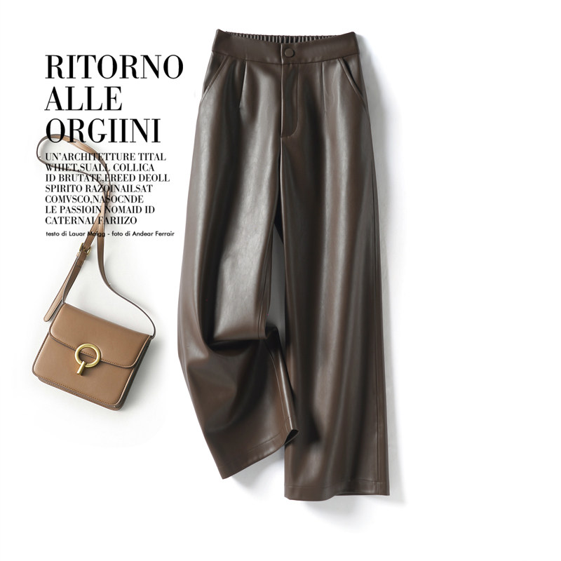 九分pu皮裤女秋冬新款高腰显瘦宽松小个子九分咖色休闲直筒阔腿裤