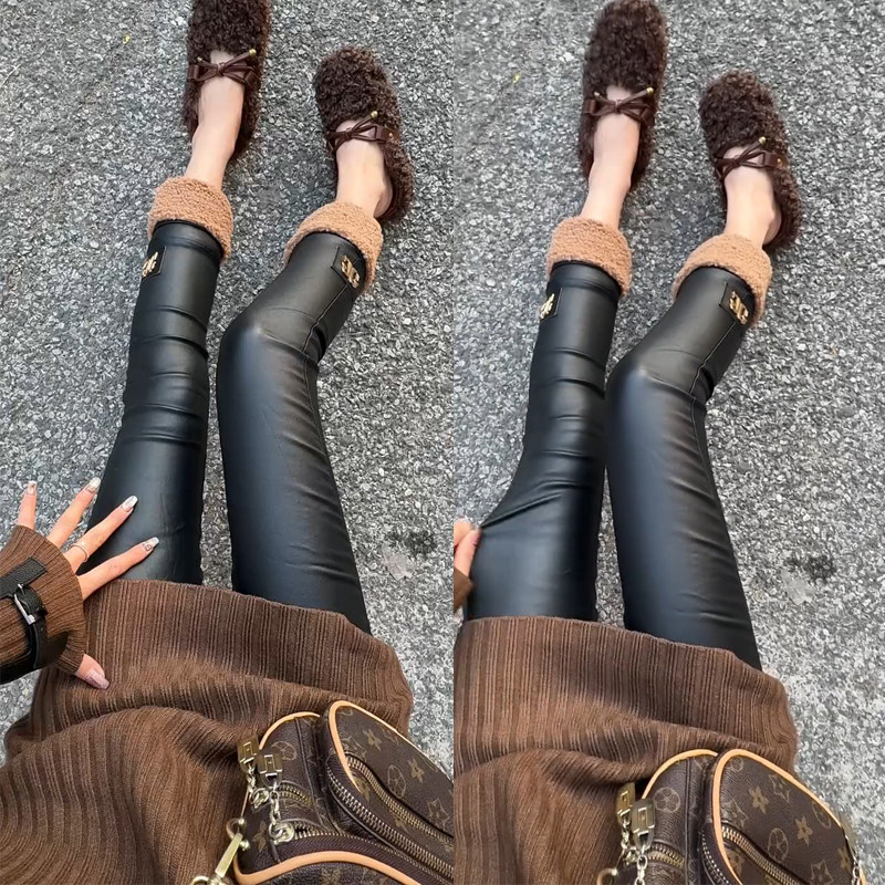 2024秋冬新款九分裤裤脚羊羔毛加绒图层皮裤黑色百搭欧货洋气女裤