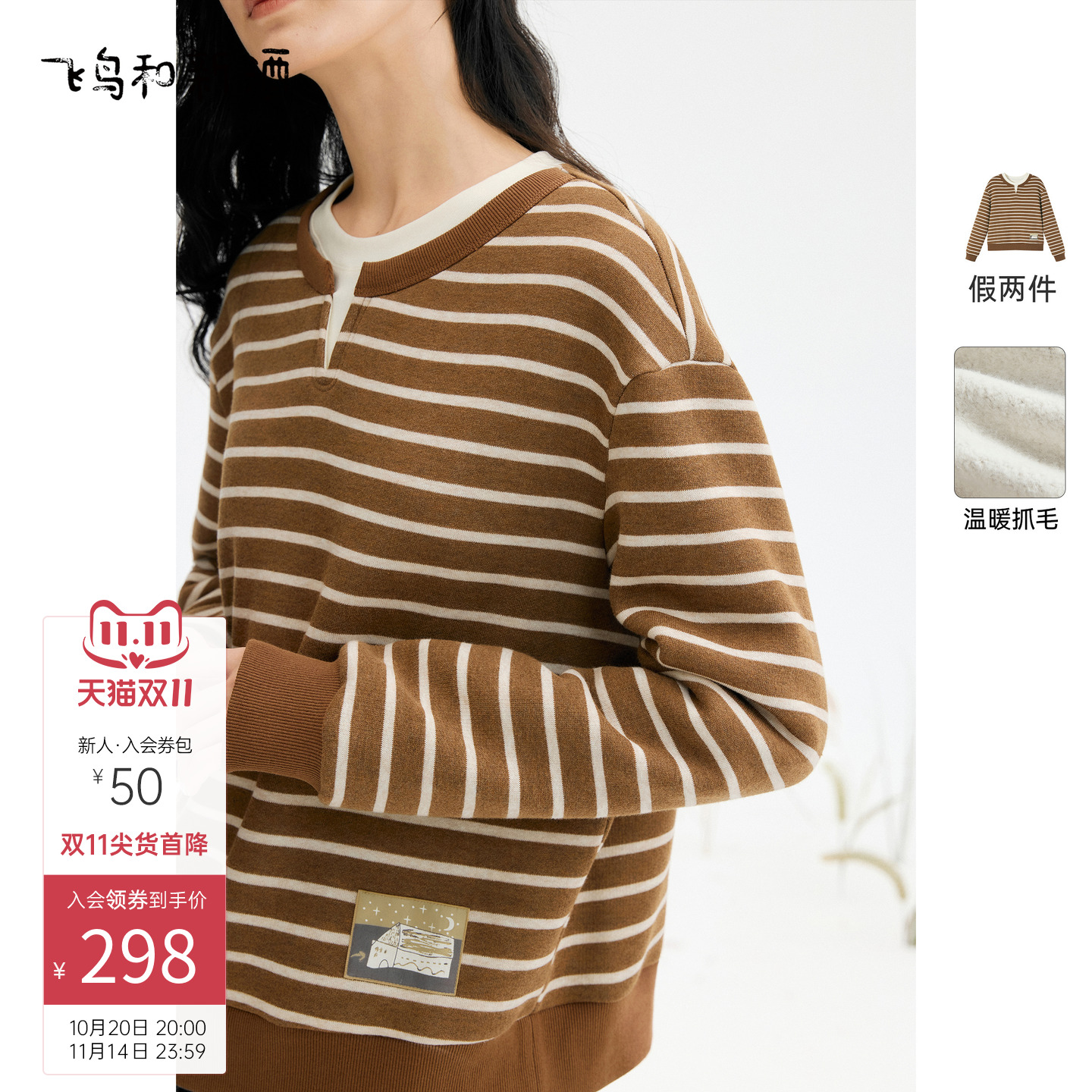 【假两件】飞鸟和新酒撞色条纹卫衣女2025冬季新款宽松圆领上衣