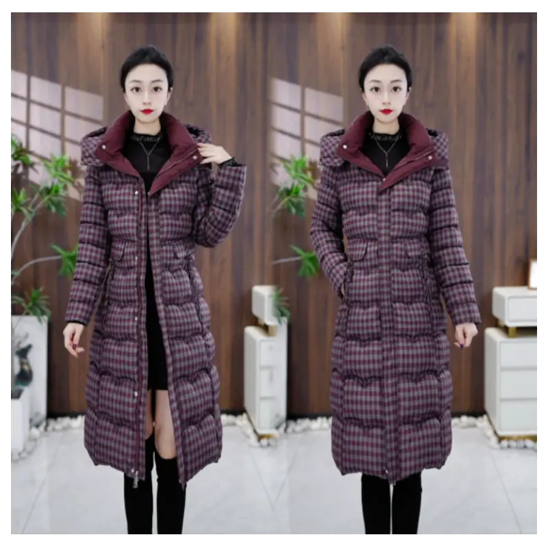 2025冬季新款格纹连帽棉服女中长款修身显瘦加厚保暖时尚棉衣外套