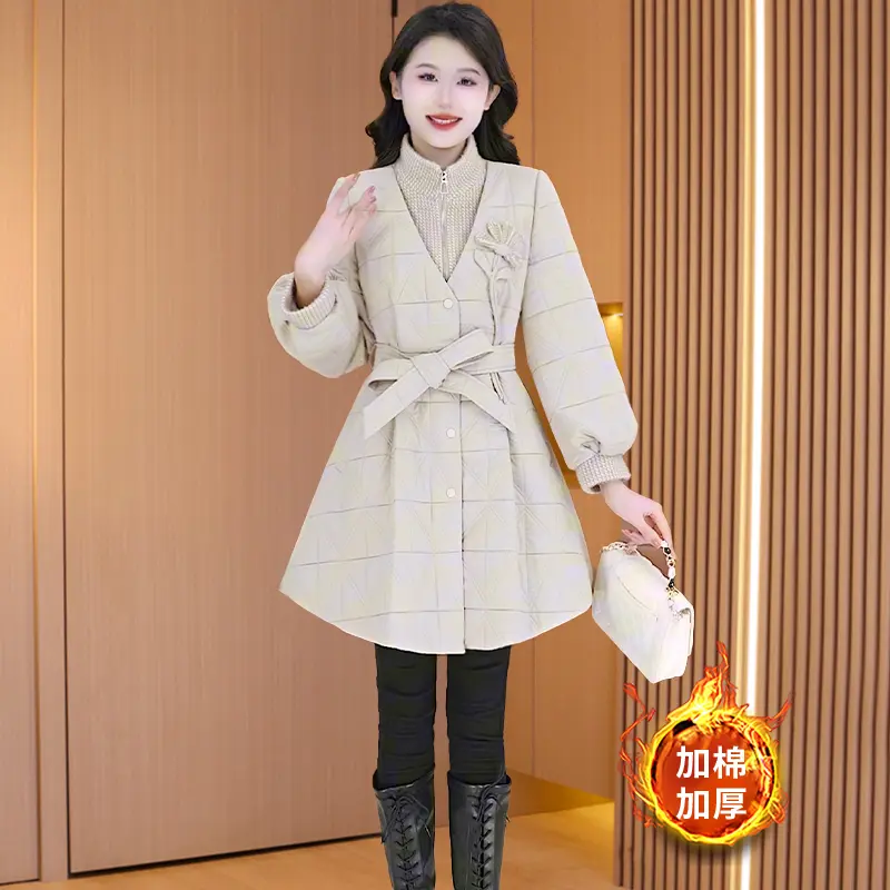 邑品菱格中长款棉衣女2025春季新款休闲百搭轻薄保暖宽松棉服外套