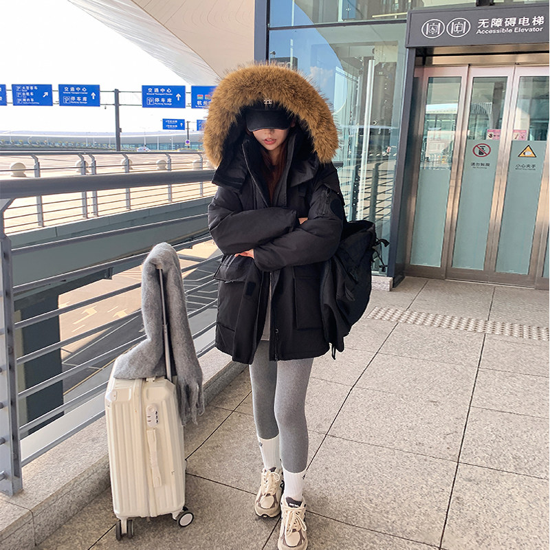 实拍美式毛领连帽夹棉派中长款棉服女冬季宽松保暖座山雕冲锋外套