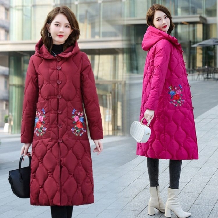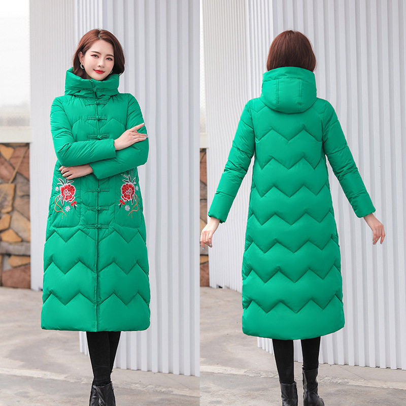 中国风复古棉袄刺绣中长款过膝羽绒棉服女盘扣外套羽绒服女士冬季