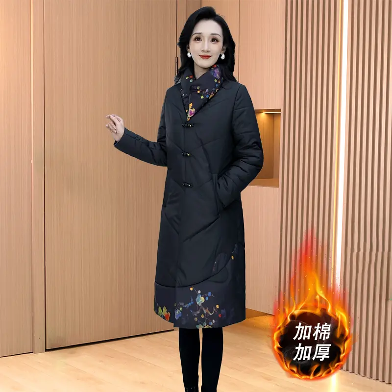 2025新款妈妈冬装国潮中长款过膝加厚棉服绣花唐装中国风旗袍外套