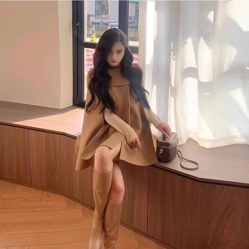 阔色气质披肩斗篷毛呢外套短款女2025秋冬季新款卡其色呢子大衣