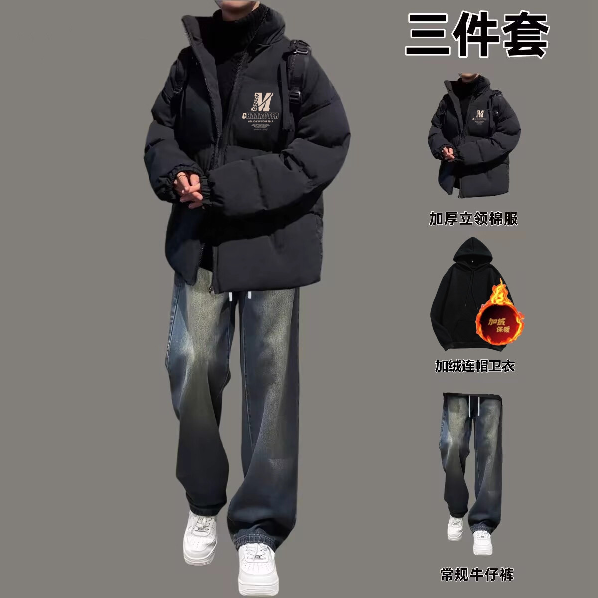 冬季套装男棉衣外套加绒加厚一整套学生帅气面包服棉衣穿搭三件套