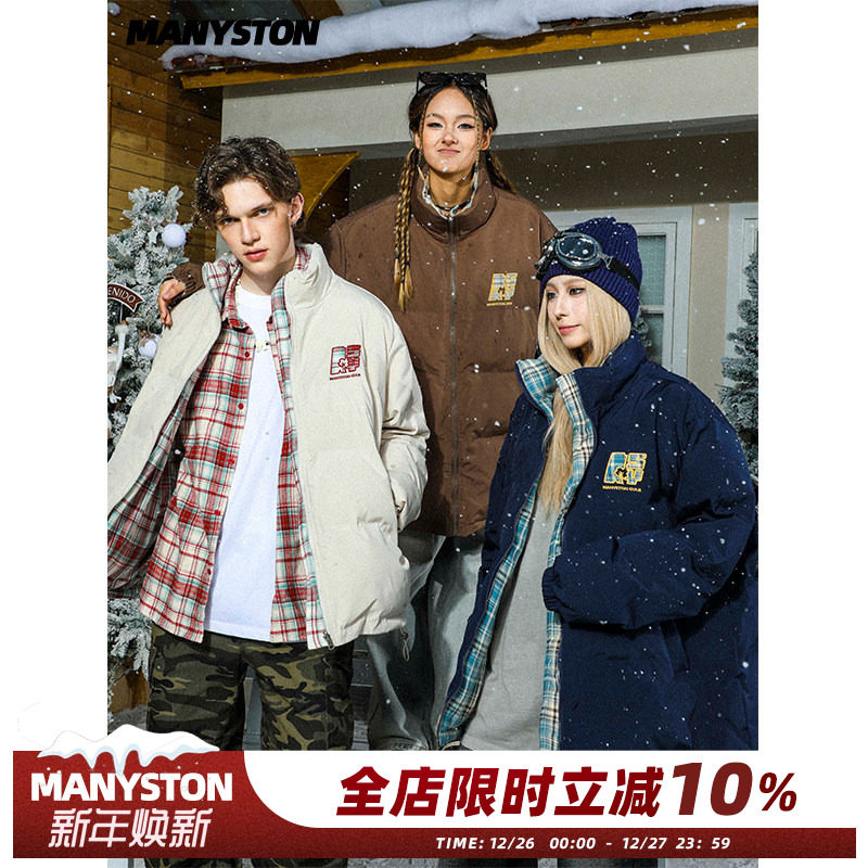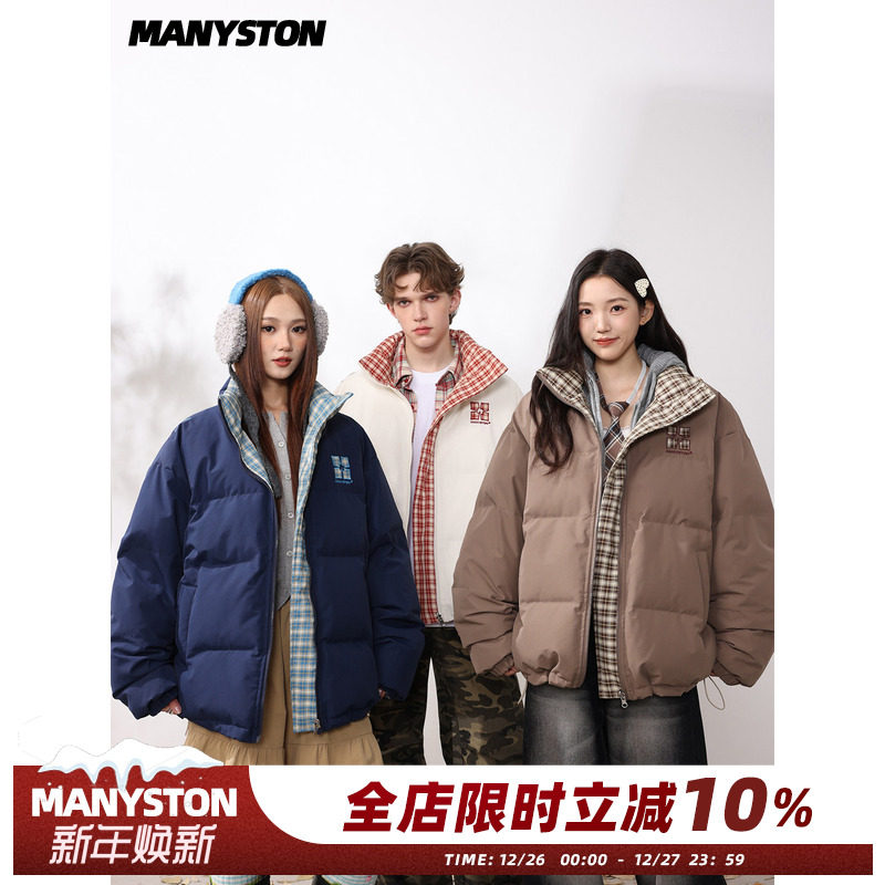 MANYSTON美式潮牌格子双面穿棉服男款冬季加厚保暖面包服棉衣外套