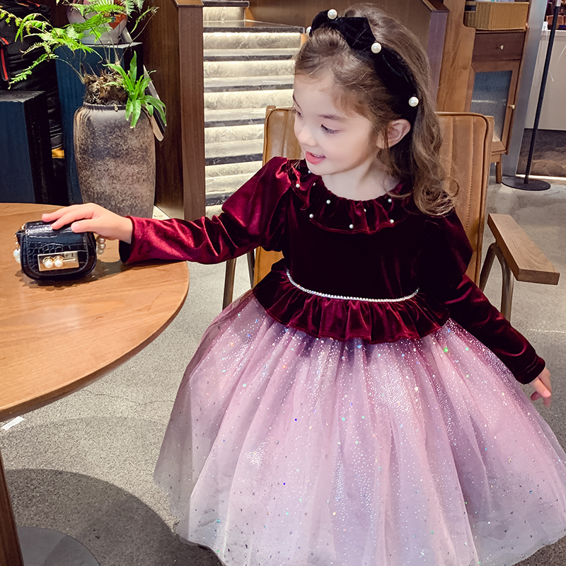 米米哈罗女童公主裙冬装2025新款法式儿童丝绒裙小女孩网纱连衣裙