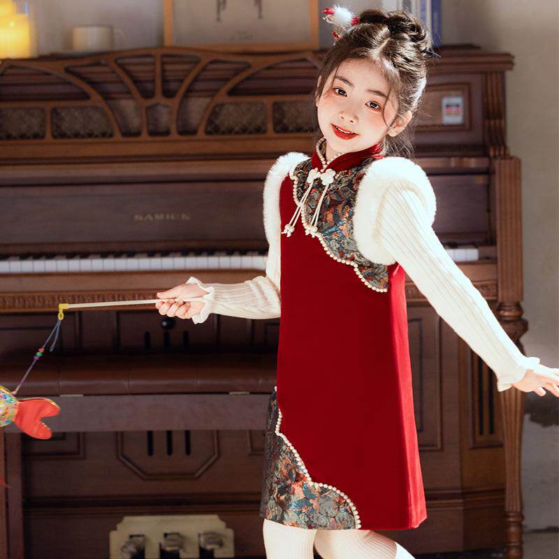 女童唐装旗袍连衣裙冬裙子儿童马甲背心裙中国风加厚拜年礼服红色