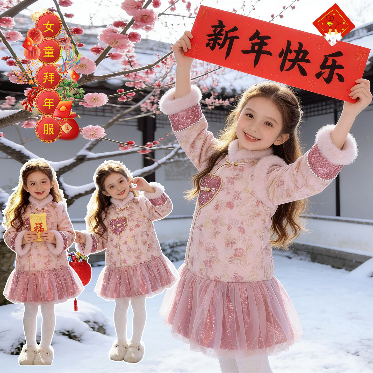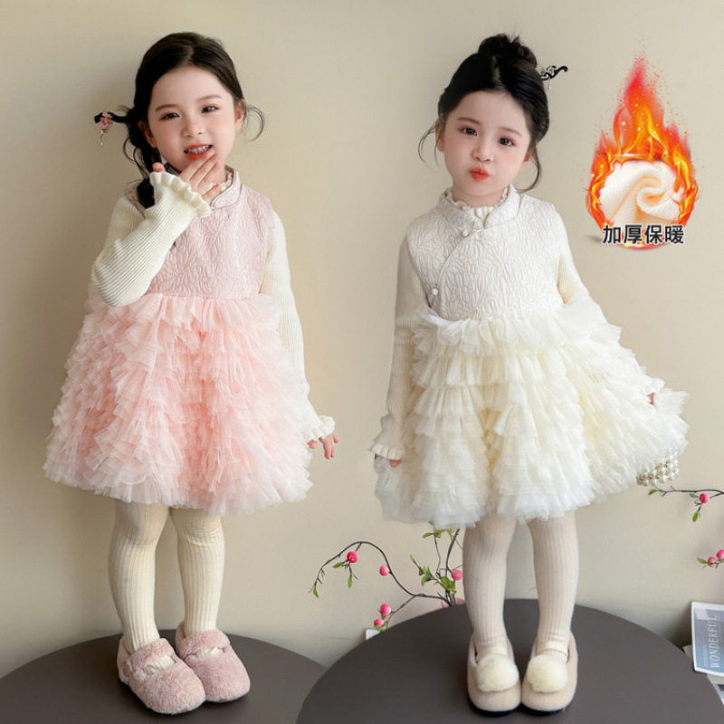 女童连衣裙加厚中式拜年服粉色2025新款儿童女宝冬裙过年服公主裙