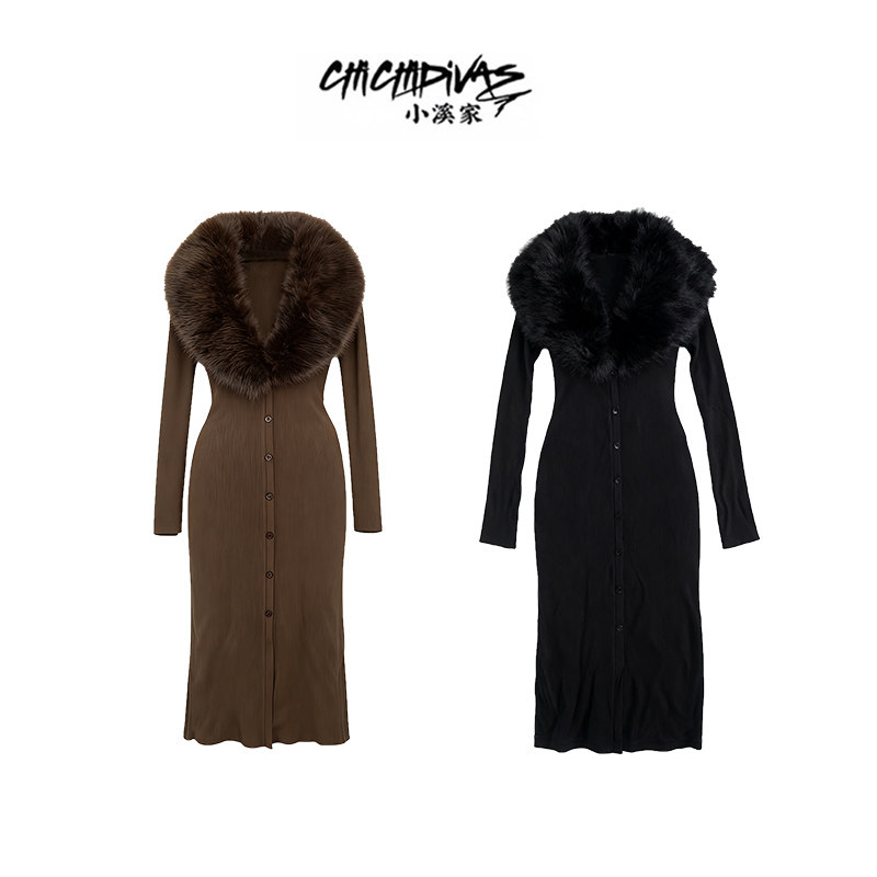 (小溪家)可拆卸毛毛领坑条加厚磨毛针织连衣裙修身气质秋冬裙子