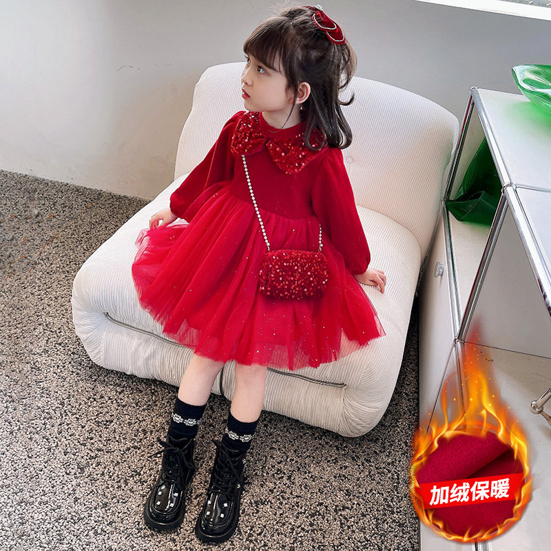 女童连衣裙秋冬装加绒拜年红色裙子儿童纱裙女宝宝公主裙加厚冬裙