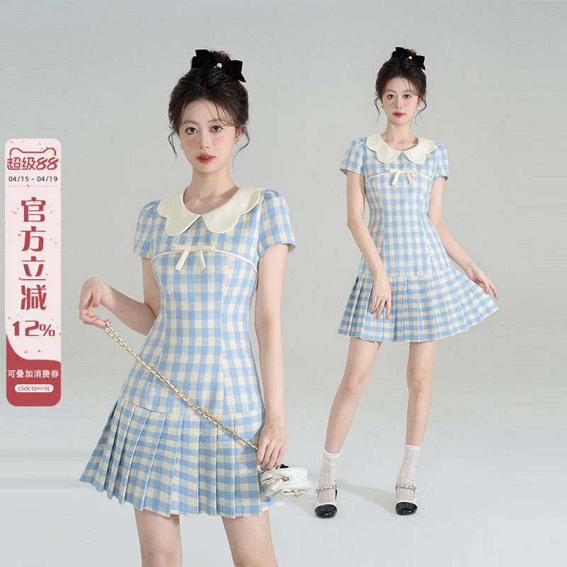 蓝色学院风娃娃领短袖格子连衣裙女夏季甜美设计感气质收腰a字裙