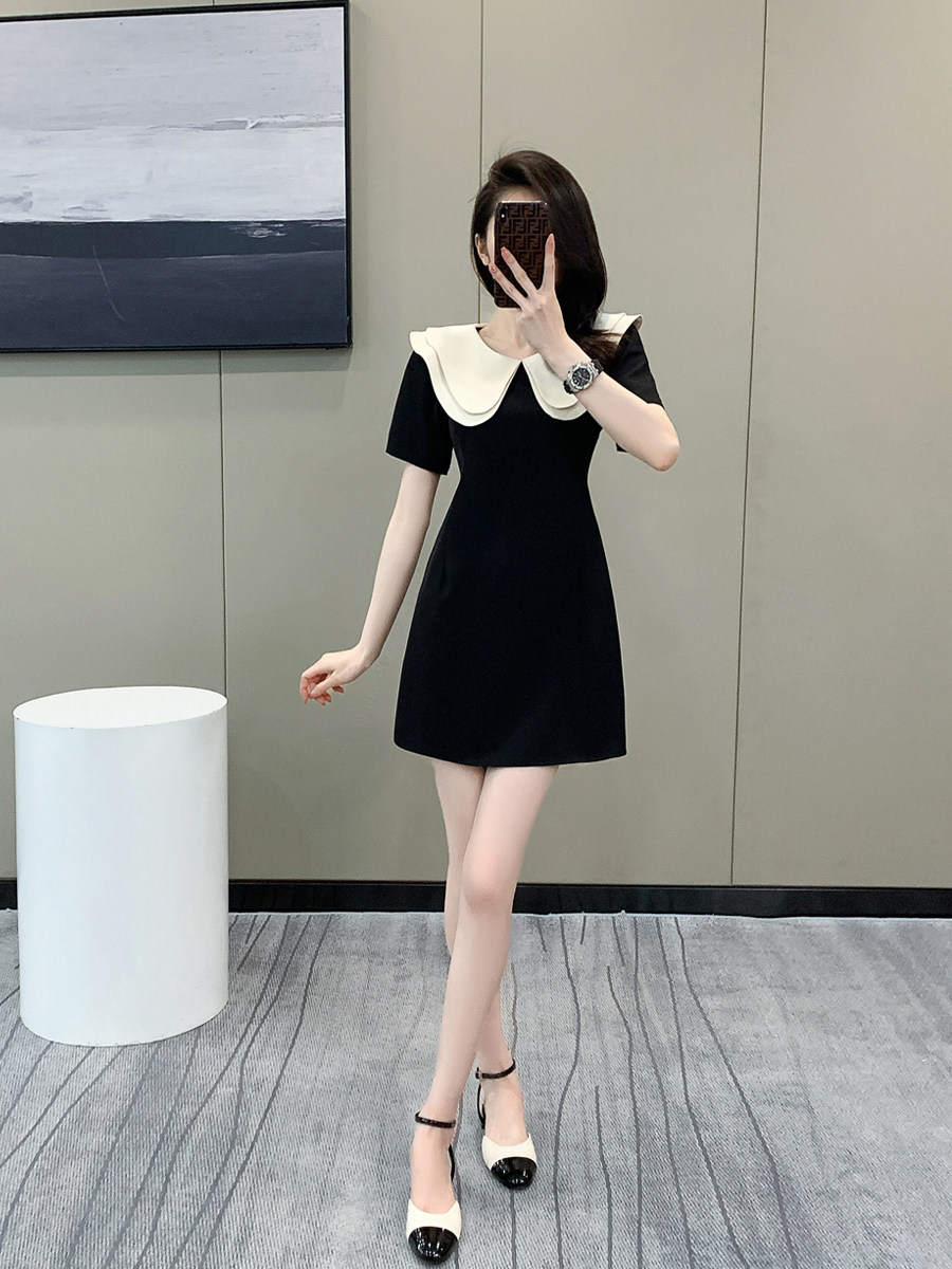 黑色短袖连衣裙女夏季小个子法式气质通勤收腰娃娃领高腰a字短裙