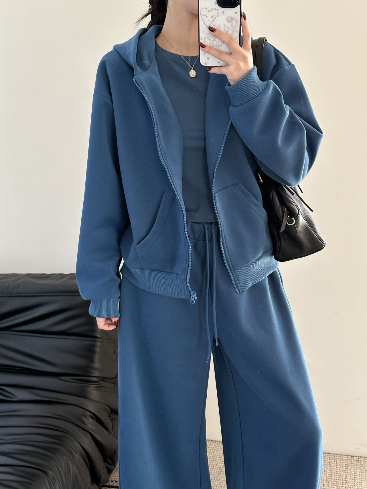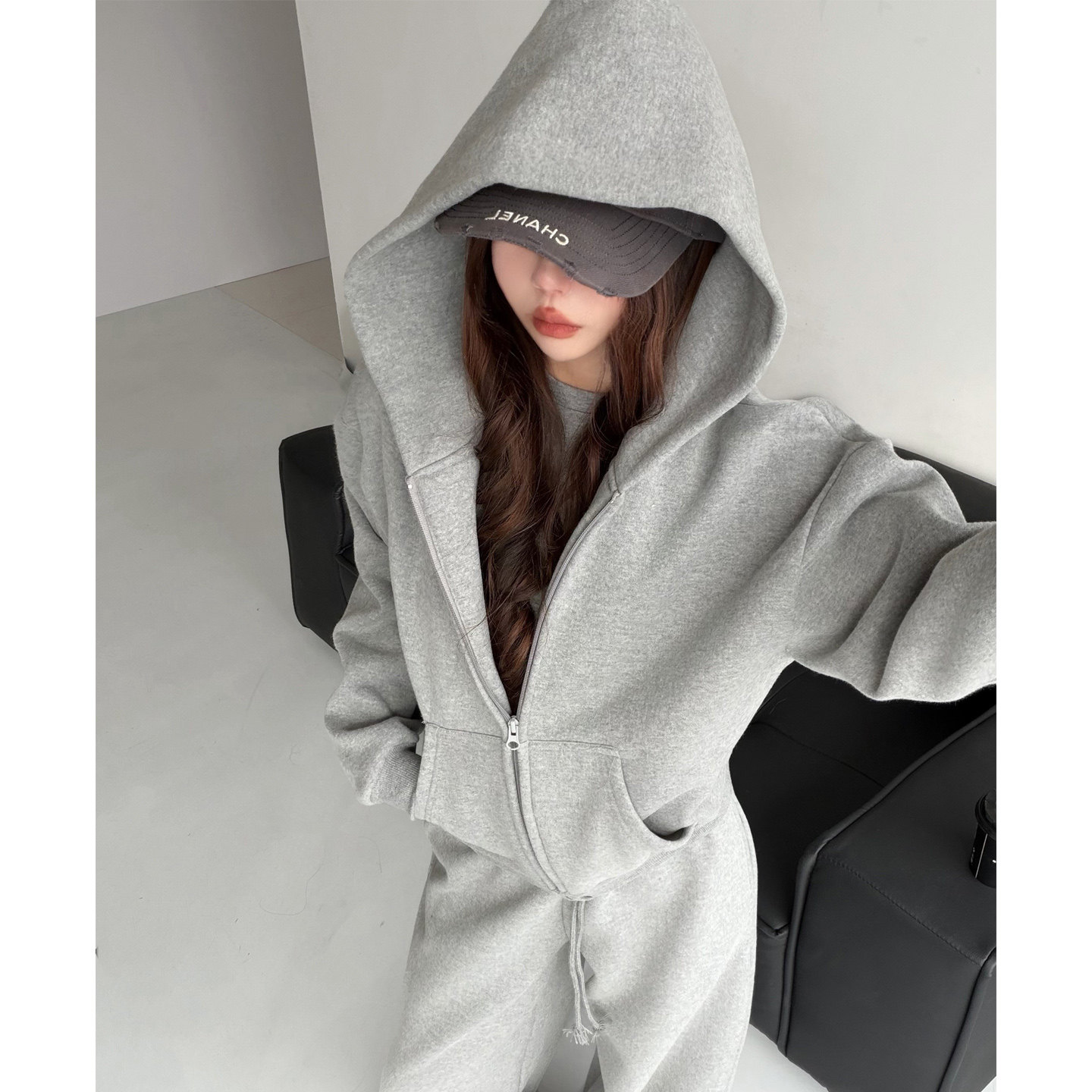 '镇店'私服同色系三件套!加绒连帽卫衣双腰卫裤修身打底衫套装女