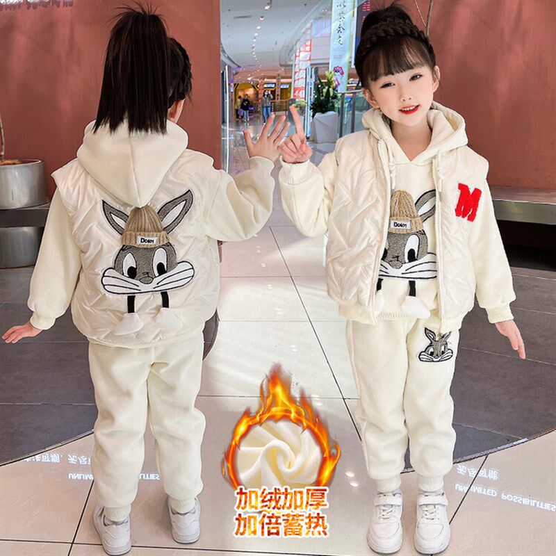 女童套装加绒冬季加厚新款女宝宝洋气冬装儿童卫衣保暖马甲三件套