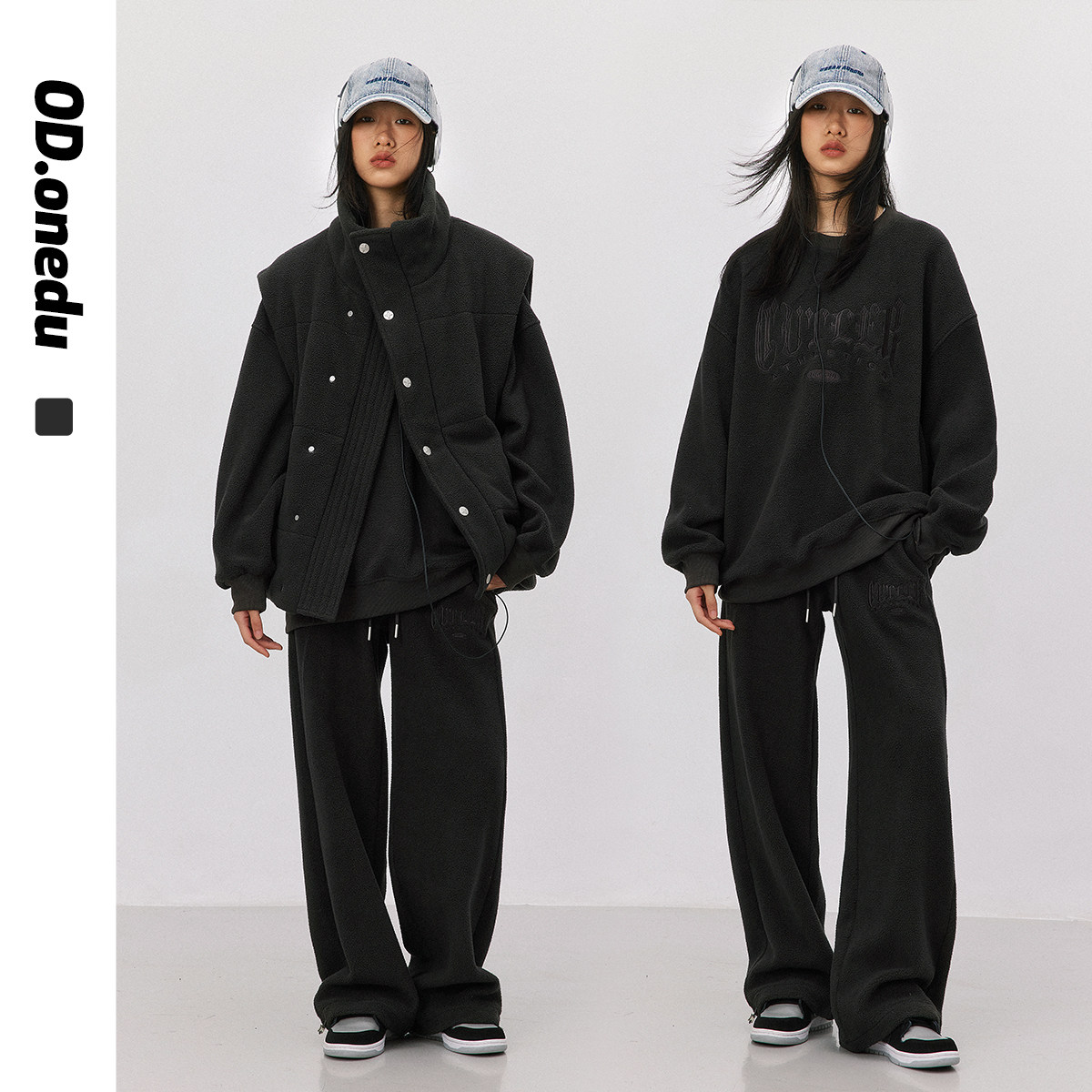 oo&vv立领撞色充绒马甲+抓绒加厚卫衣卫裤运动风休闲三件套女26冬