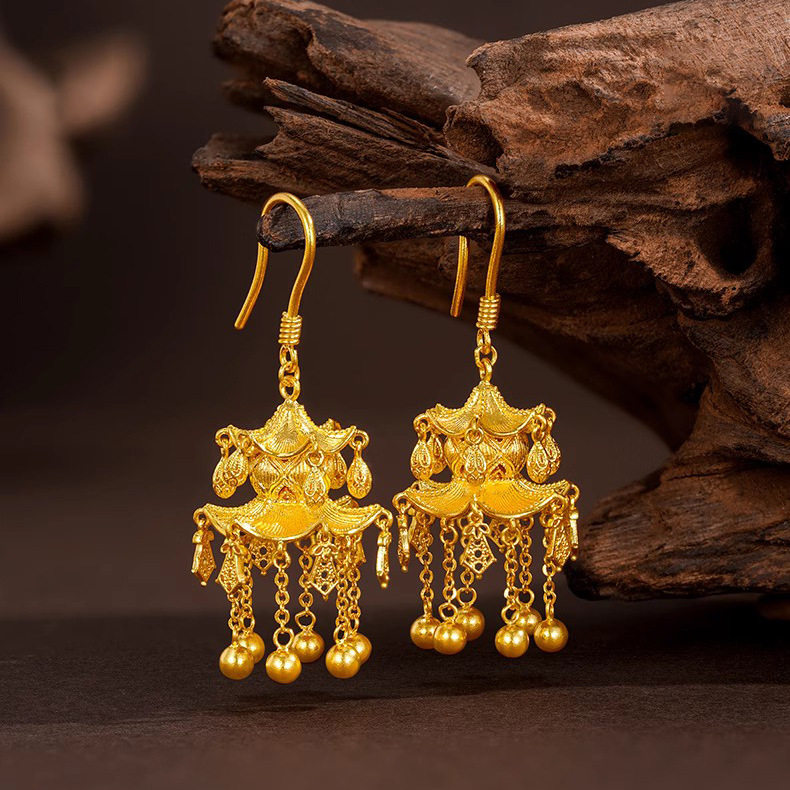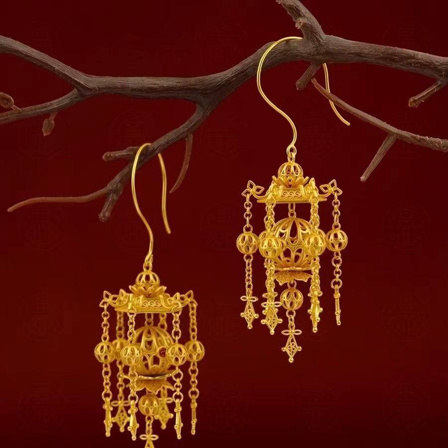金店同款沙金花丝亭台楼阁宫灯流苏耳钩结婚婚嫁仿三金耳环送女友