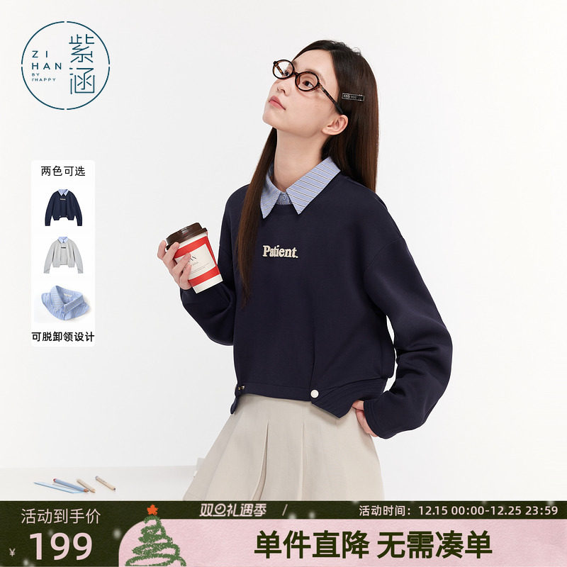 紫涵短款衬衫领长袖卫衣女秋季新款韩系简约字母刺绣宽松长袖上衣