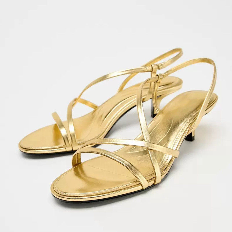 西班牙2025夏季新品一字带中空性感女鞋金色皮面尖头猫跟高跟凉鞋
