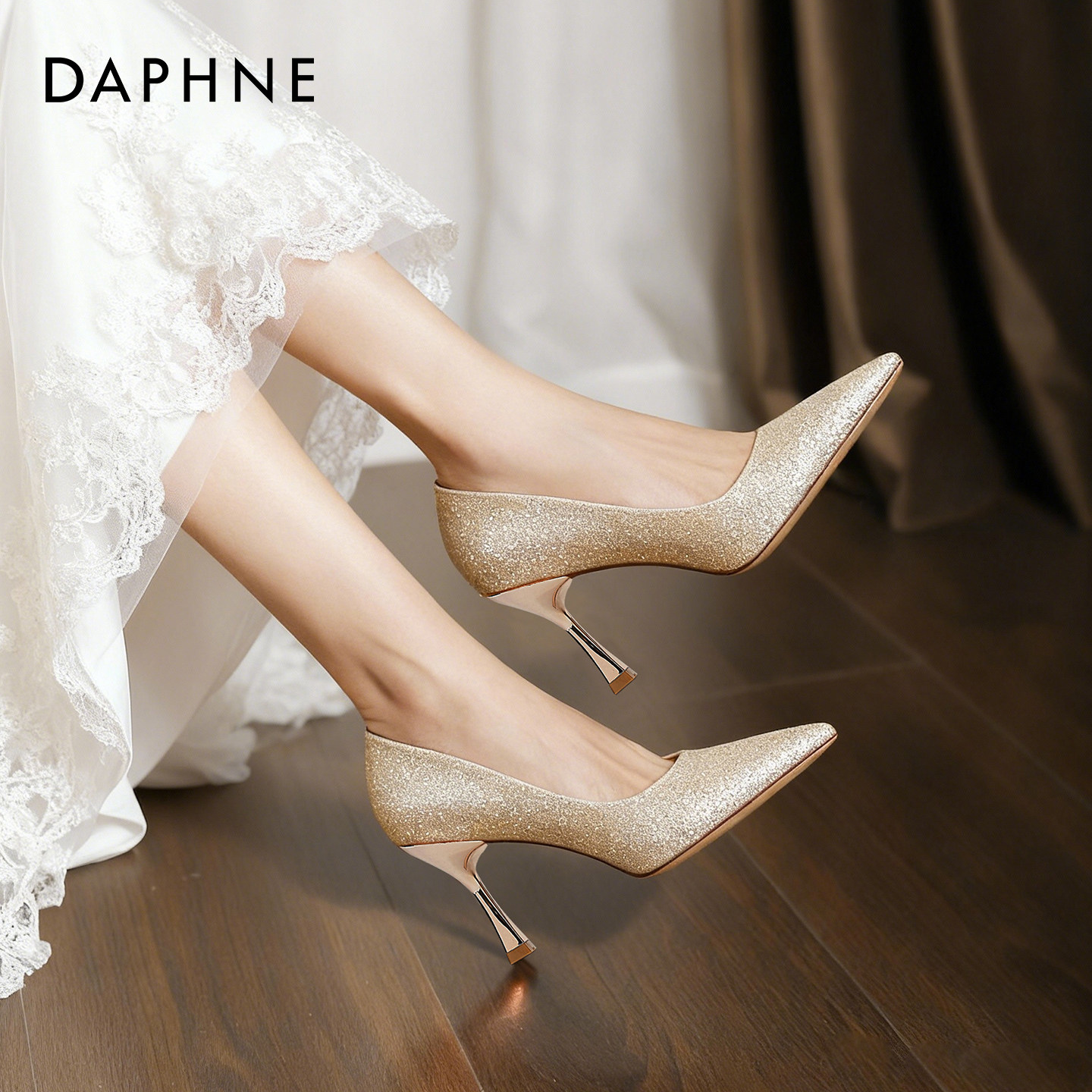达芙妮尖头单鞋女2026新款金色高跟鞋女气质高级不累脚新娘婚鞋子