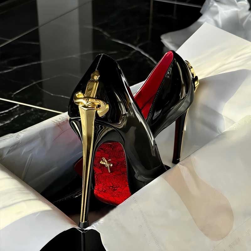 2026新款御姐风漆皮黑色单鞋女金色利刃细跟尖头性感红底高跟鞋