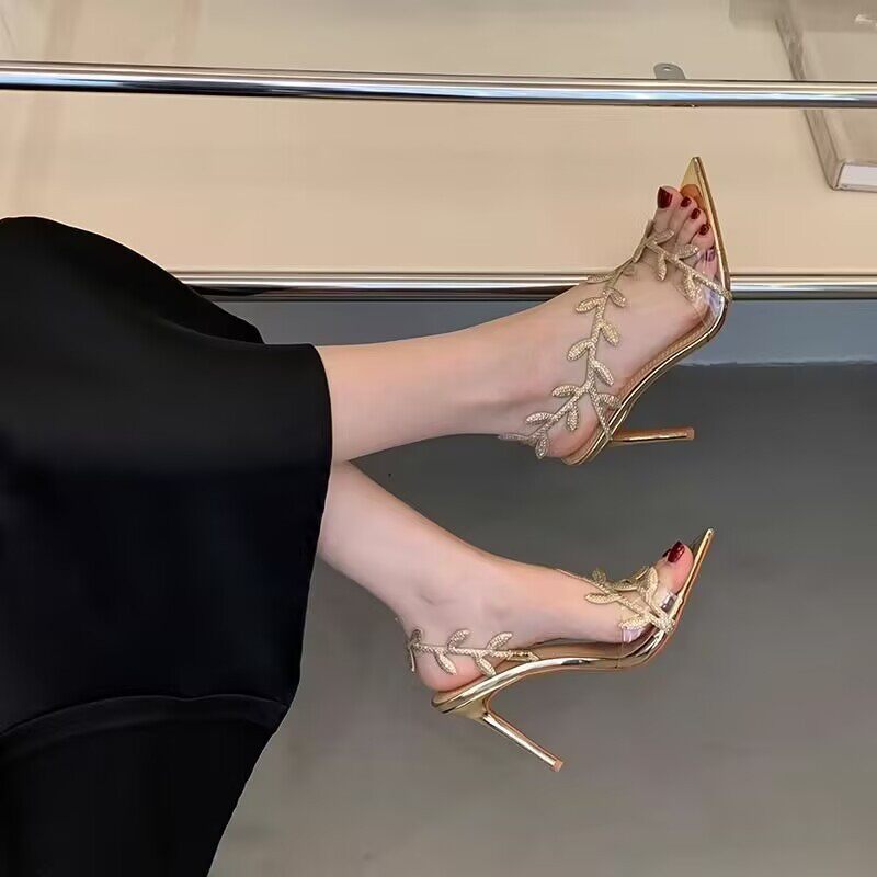 新款一字带露趾金枝玉叶细高跟凉鞋女夏高级设计感尖头金色高跟鞋