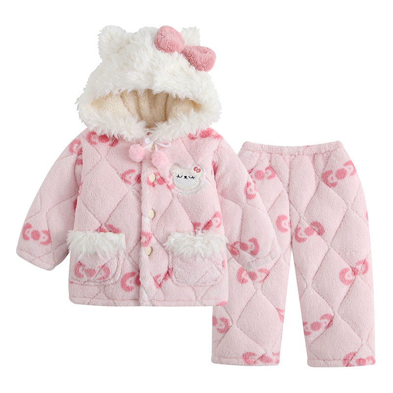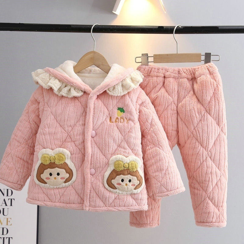 冬季女童带帽三层夹棉加厚家居服套装女孩宝宝卡通保暖珊瑚绒睡衣
