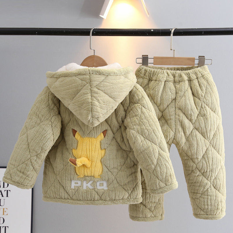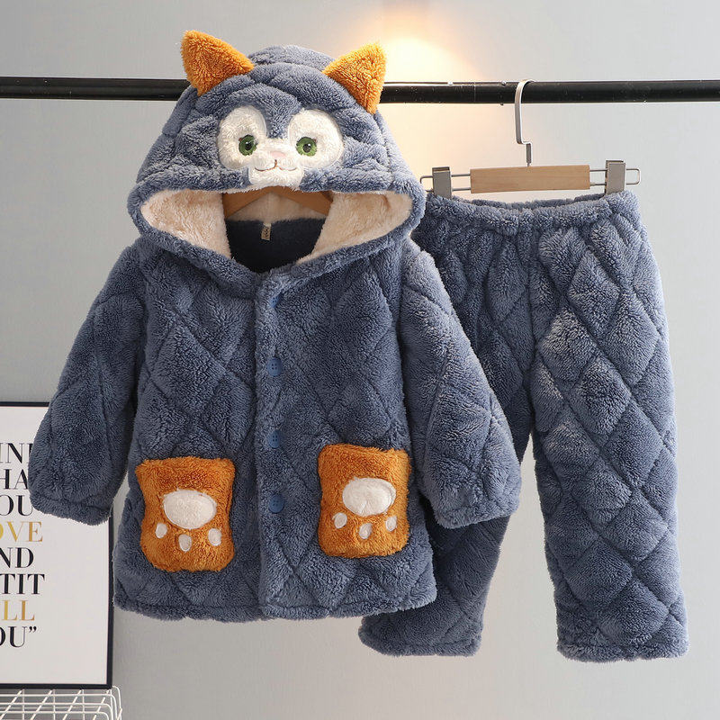 冬季儿童睡衣法兰绒三层加厚夹棉卡通男女宝宝家居服保暖睡衣带帽
