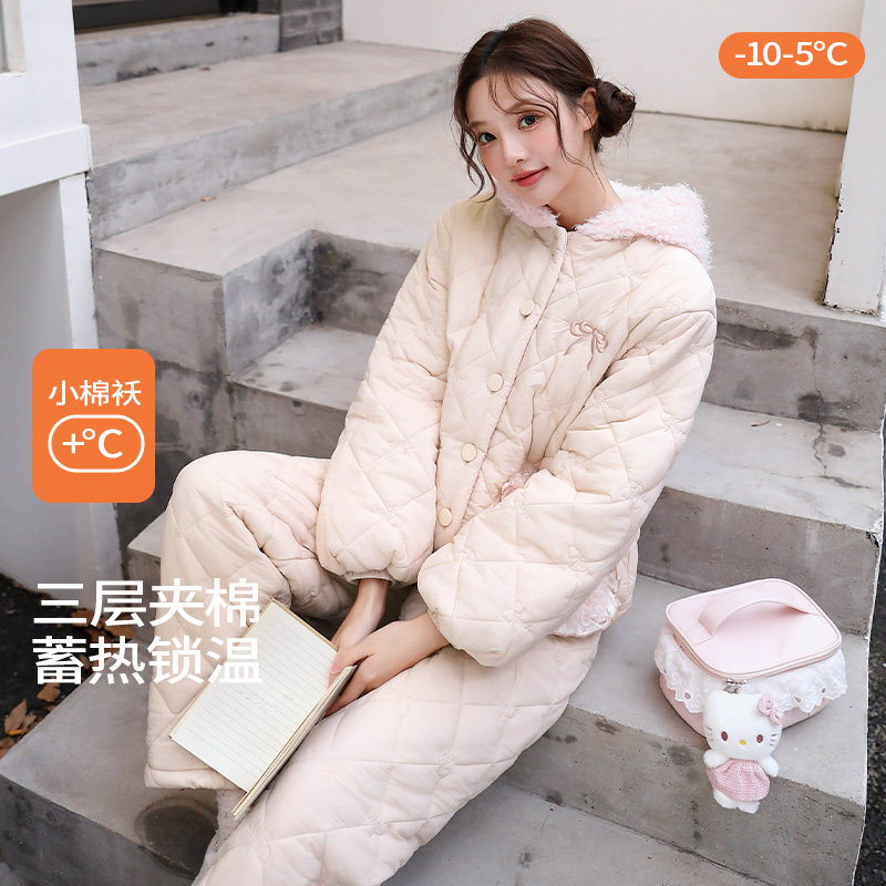 三层夹棉珊瑚绒女睡衣冬季加绒加厚拉链可爱法兰绒带帽家居服套装